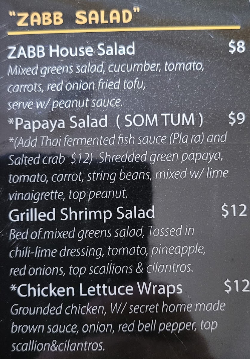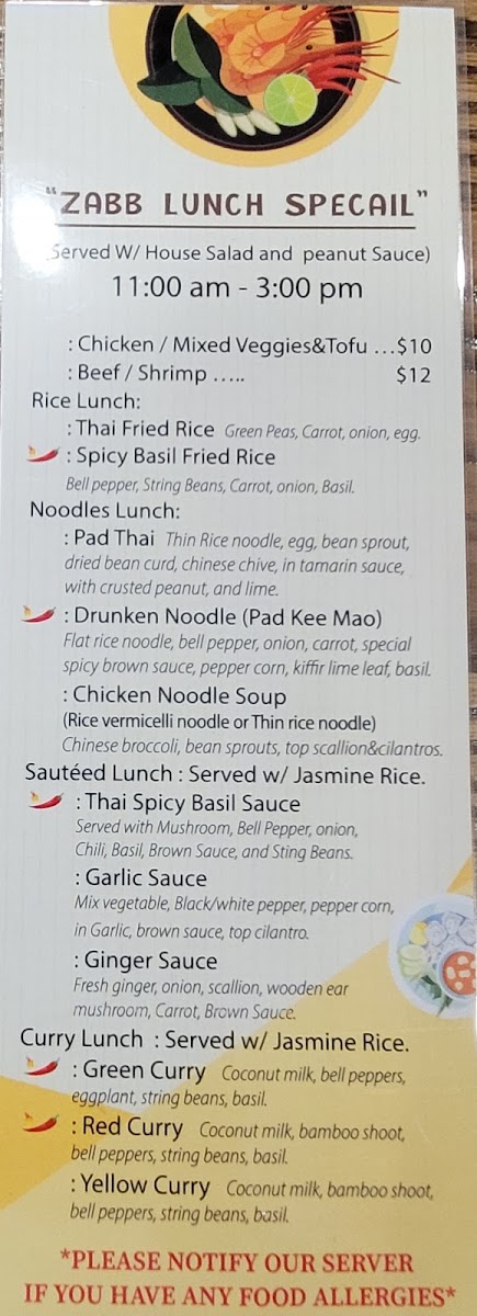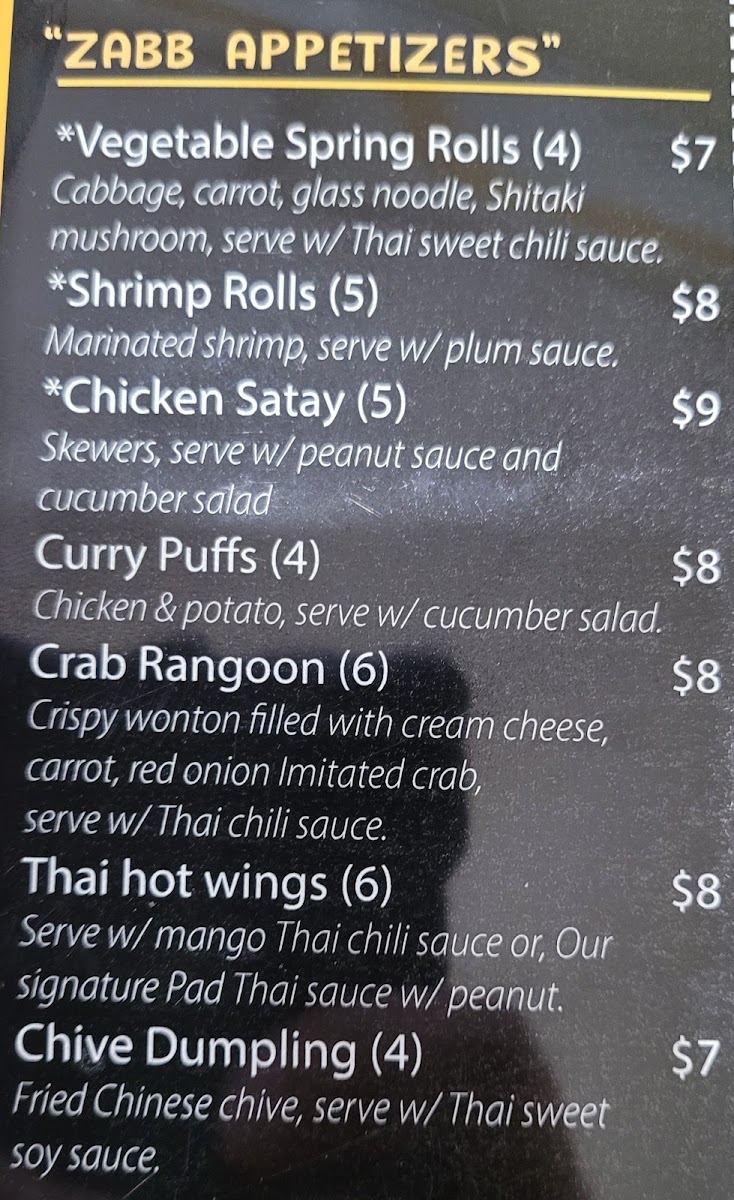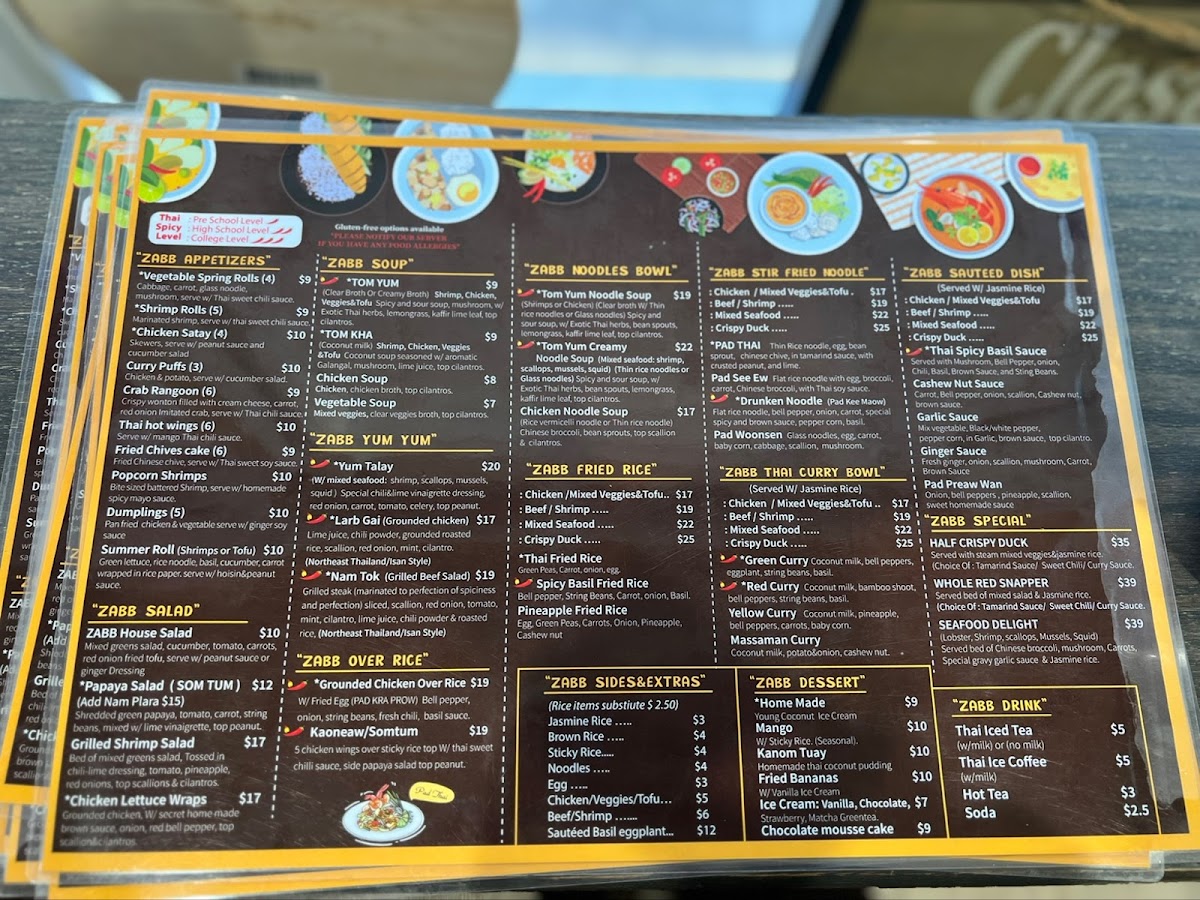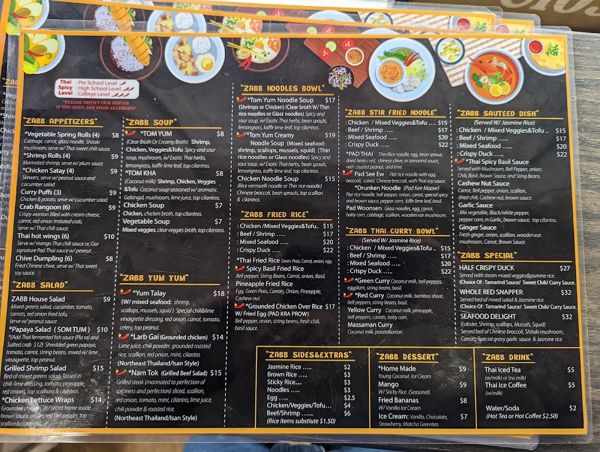 Don't forget to indulge in the mango sticky rice for dessert, a must-try that wraps up your meal on a sweet note. Whatever you choose, Zabb Thai Kitchen promises a meal you won't forget!